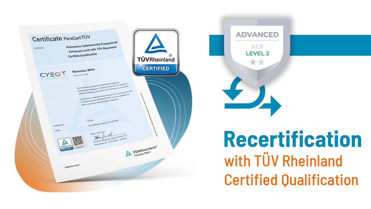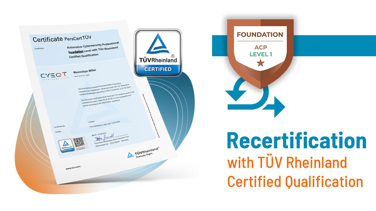 The ACP certification aligns with current standards such as ISO/SAE 21434 and UN R155. Because rules, regulations, and technologies evolve, recertification ensures your qualification reflects the latest state of the art.